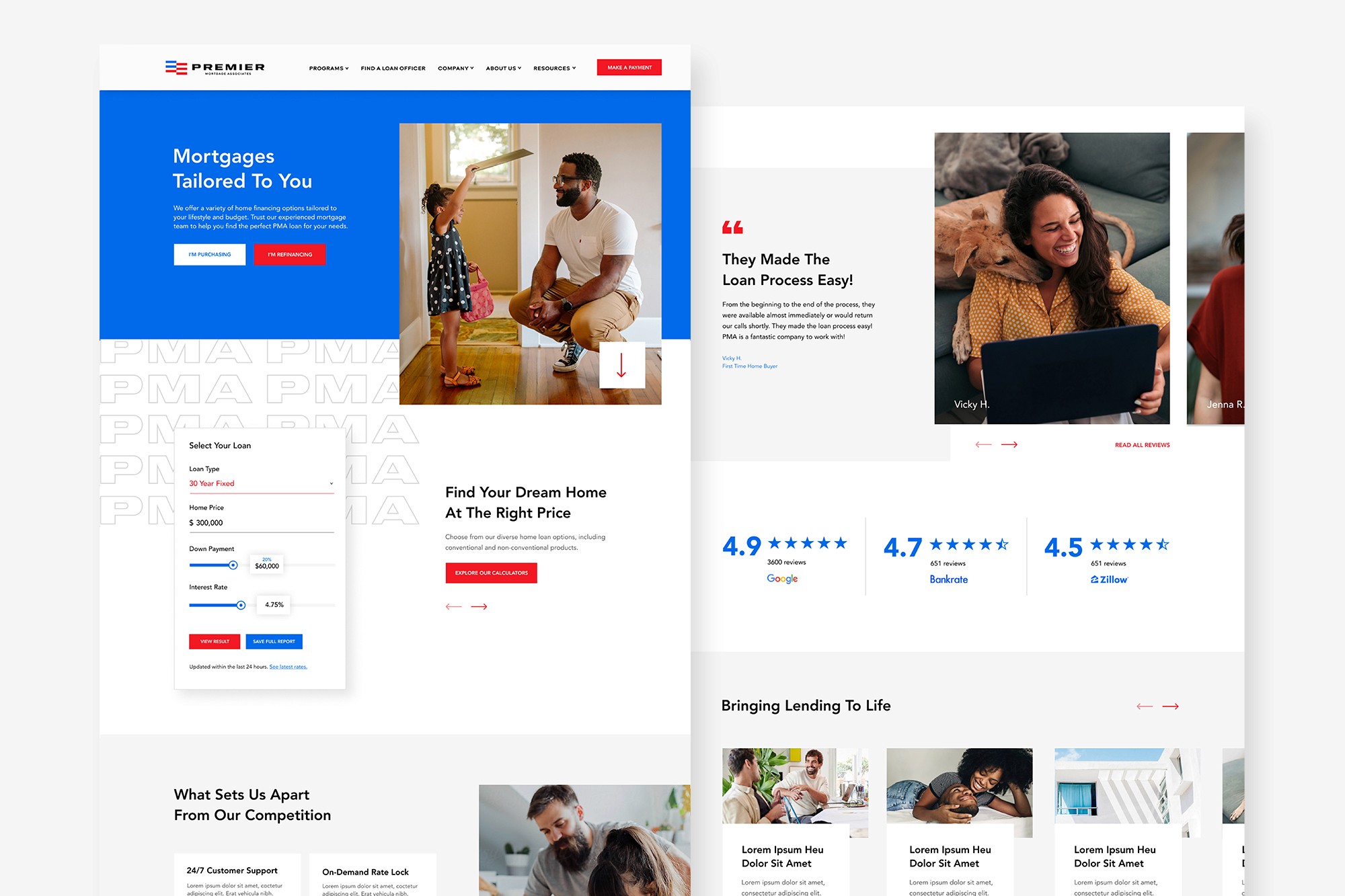 Premier Mortgage Associates (PMA), a national mortgage lender operating in 48 states, faced challenges with a disjointed brand despite their business success. I was brought on to unify and modernize their brand for sustainable growth. To build a cohesive identity, I established core brand principles rooted in PMA’s patriotism and customer-first values, shaping the visual direction. The result was a refreshed logo inspired by the U.S. flag, symbolizing patriotic professionalism, and a redesigned digital presence that emphasizes service with integrity and reinforces PMA’s commitment to customer care. You can view the full web design in more detail via the Figma link below.